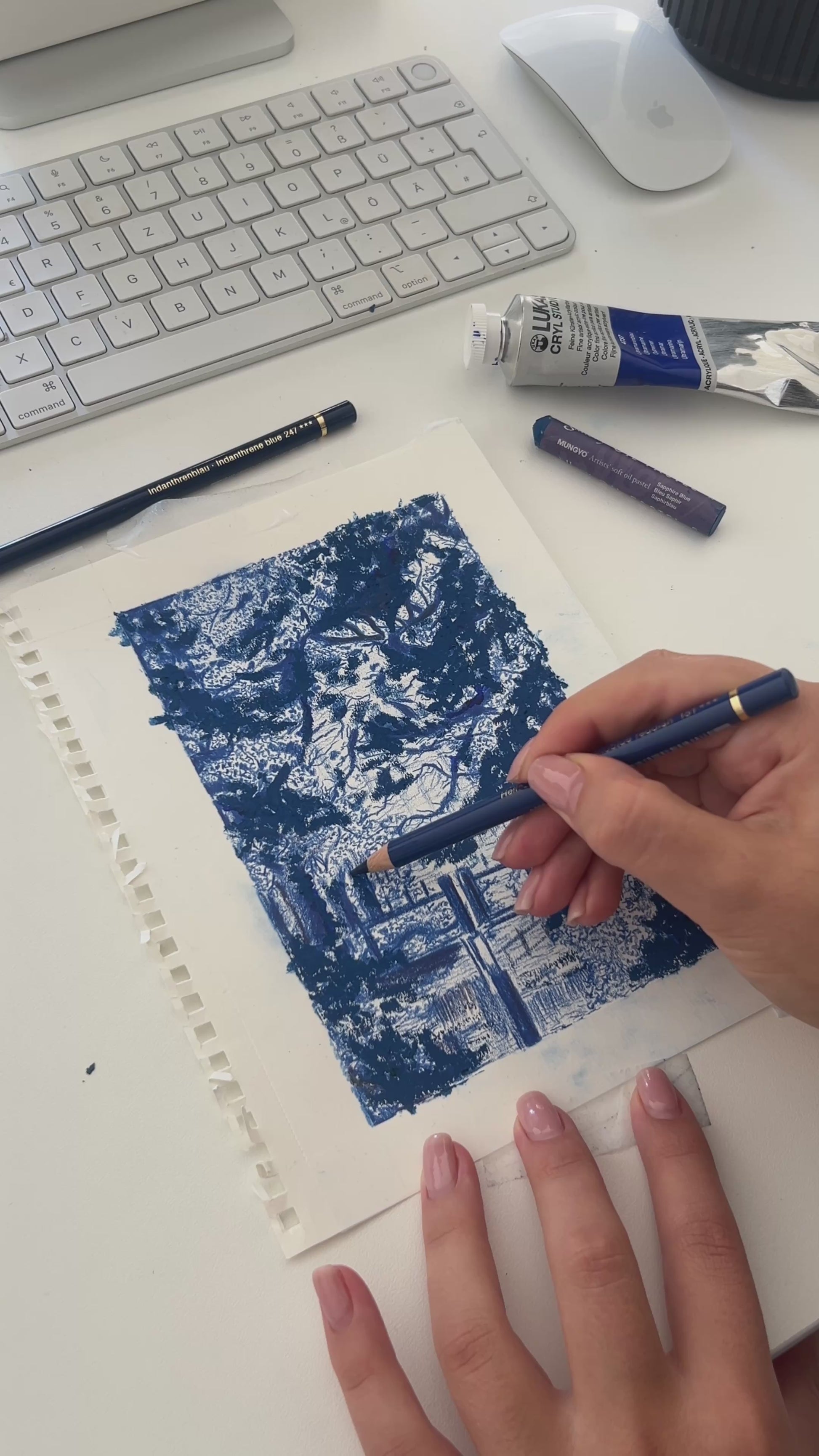 I created it using a combination of Polychromos pencils and oil pastels, a blend of precision and surrender. The fine lines reflect my need for detail, while the broader, freer strokes embody my willingness to let things unfold as they will. I also added subtle touches of acrylic paint to give the piece more structure and depth.